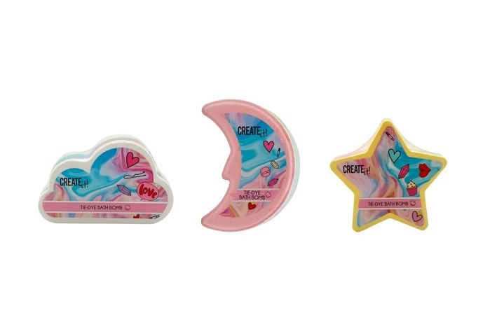S koupelovou sadou od Create it! se koupání stane zábavným a magickým zážitkem. Tyto šumivé koule do koupele promění tvou vanu v sladkou duhovou tie-dye spirálu, kde měsíc, hvězdy i mraky nikdy nebyly tak jasné a veselé.Koupání už nikdy nebude nudné, šumivé a praskající koule do koupele od Create it! přinesou radost a relaxaci. Stačí si udělat čas, ponořit se do teplé vody a užívat si barevnou show. Koule do koupele Bath Tie-Dye jsou k dispozici ve třech tvarech: mrak, hvězda a měsíc.Produkty jsou dermatologicky testované, bezpečné a vhodné pro dívky ve věku 6–14 let. Balení je vyrobeno ze 100% recyklovatelného PET a FSC certifikovaného papíru a hravý design podporuje kreativitu a radost z koupele.