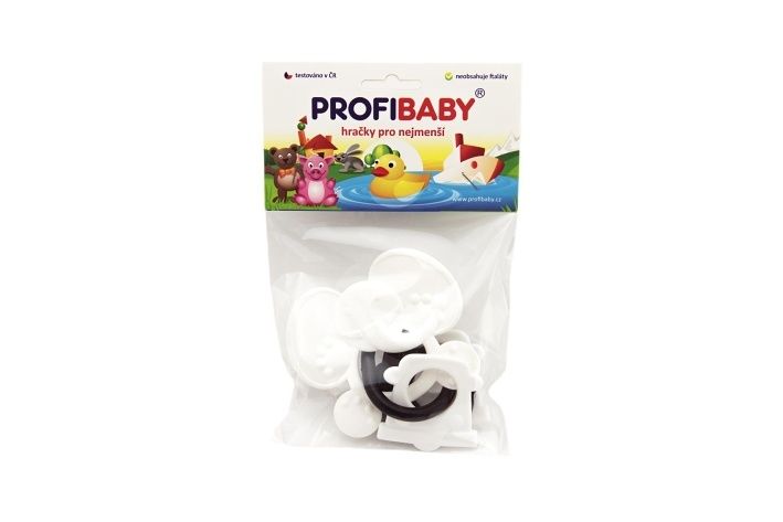 Kousátka zvířátka + přívěsky plast černobílé 9cmv sáčku 0m+ 4druhy