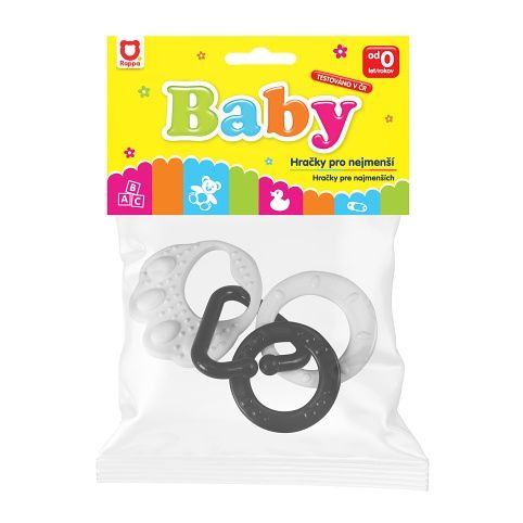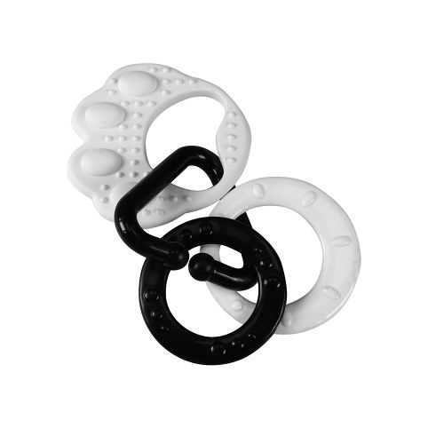 Kousátko v černobílé kombinaci dokonale stimuluje smysl zraku u dítěte, které dosud nerozlišuje barvy. Na tlapičce jsou zavěšené plastové tvary v různých provedeních, ať už ve tvaru kolečka, srdíčka, zvonečku apod.