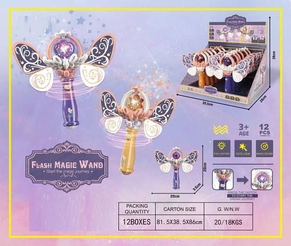 Kouzelná hůlka s křídly. Délka 20 cm. Display 12 ks. 2 varianty - fialová, žlutá. Světelné a zvukové efekty, aktivace tlačítkem. Několik zvukových efektů, které se přepínají opakovaným stiskem tlačítka.