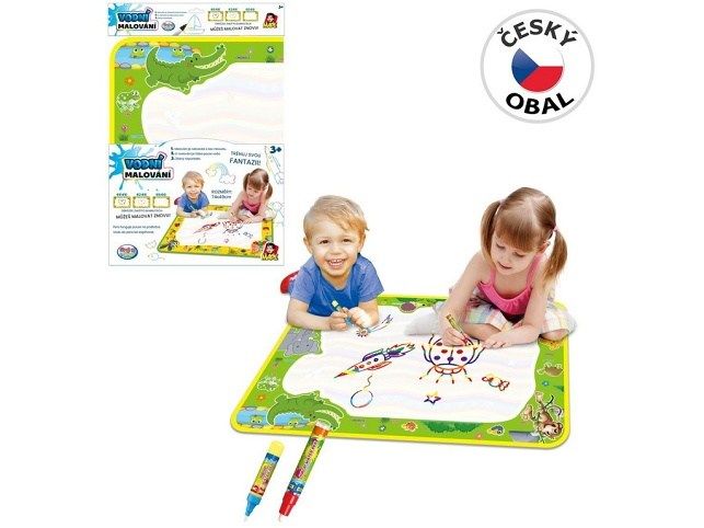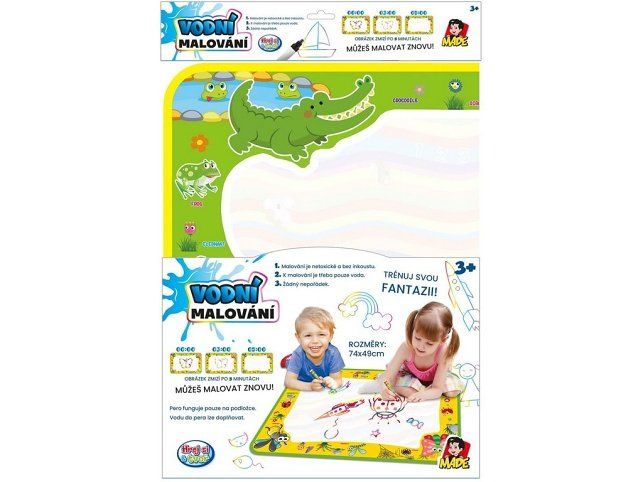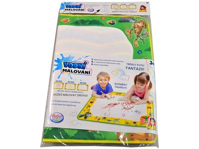 Kouzelné malování vodou s motivy zvířátek je z kolekce,, Hrej si a tvoř''. Užijte si spoustu zábavy s pomocí malovací podložky, pera a vody. Nepotřebujete žádné barvičky postačí pouze naplnit přiložené pero vodou a začít malovat. Potom už stačí jen sledovat co se bude dít a naplno si užít zábavu. Namalované obrázky po 5 minutách zmizí a děti mohou tvořit obrázky nové. Vybarvování nebylo nikdy jednodušší a zábavnější. Hračka je určena pro děti 3+. Rozměr hračky je 74 x 49 cm. Materiál hračky je vinyl.