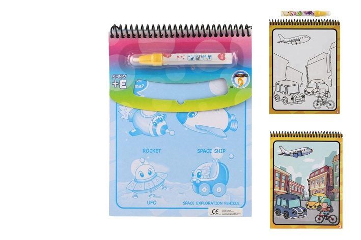 Čisté malování! Tyto "vodní" omalovánky obsahují čtyři znovupoužitelné obrázkové stránky a znovuplnitelné vodní pero. Použijte vodní pero, jehož tahy se zobrazí barvy na jednotlivých obrázcích, po uschnutí stránky obrázek opět zmizí.