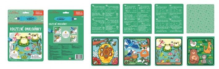 Kouzelné omalovánky disponují čtyřmi obrázky. Štětec se naplní vodou a po rozetření vody na bílou plochu obrázky získají barvu. Po vybarvení se omalovánky nechají uschnout a po úplném uschnutí jsou znovu použitelné. Balení obsahuje: 4 znovupoužitelné obrázkové plochy z tvrdého kartonu a speciální vodou plnitelný štětec.
