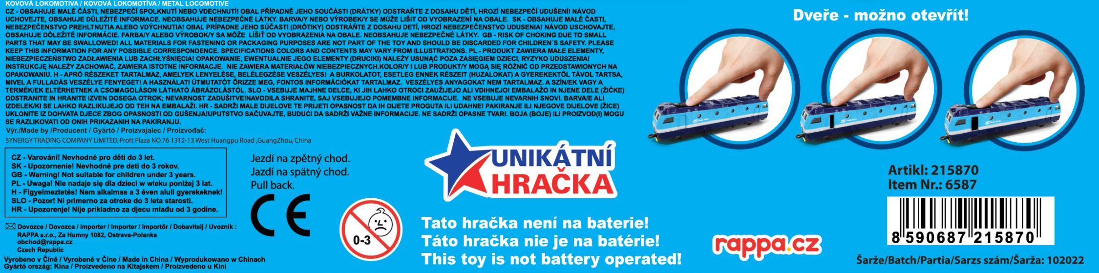 Originální 17 cm dlouhá lokomotiva společnosti České dráhy, by neměla chybět v pokojíčku žádnému fandovi vláčků! Tento úžasný kovový model lokomotivy je ideální jako dárek nebo jako sběratelský kousek! Při koupi více kusů je lze jednoduše zapojit za sebou. Má otevírací dveře, které ovládáte manuálně posunutím trolejí na střeše lokomotivy. Lokomotiva jezdí na zpětný chod. Rozchod kolejnice je cca 1,7 cm.