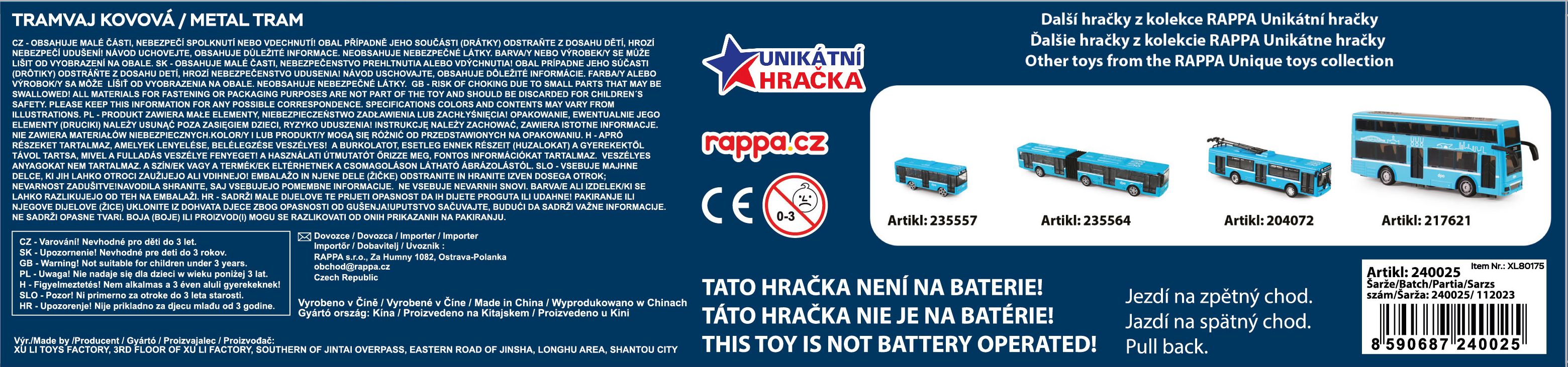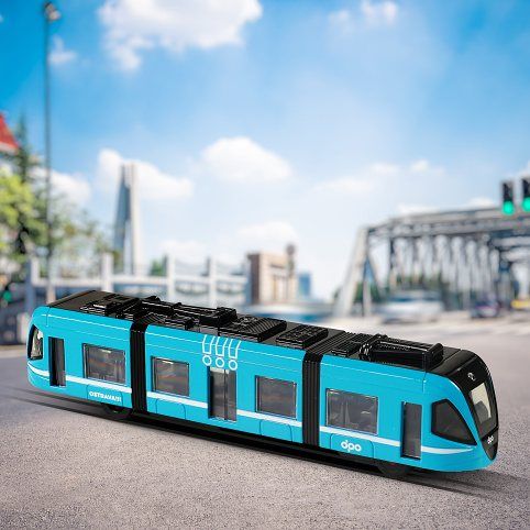 Moderní tramvaj v modré barvě, která jezdí na zpětný chod je perfektním dárkem pro všechny tramvajové nadšence. Dveře na jedné straně vozu lze manuálně otevřít a zavřít pomocí pantografu na střeše vozu. Tramvaj je vyrobená z kovu, je dlouhá 23 cm a je velmi podobná tramvaji, která jezdí ulicemi v Ostravě. Tato hračka byla vyrobena ve spolupráci s Dopravním podnikem města Ostravy a městem OSTRAVA!!!