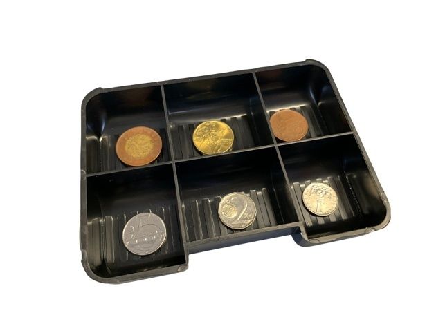 Kovová pokladna vyrobená z ocelového plechu. Obsahuje přihrádku na mince a volný prostor pro bankovky či dokumenty. Uzamykatelná a přenosná. O rozměru 150 x 110 x 80mm.