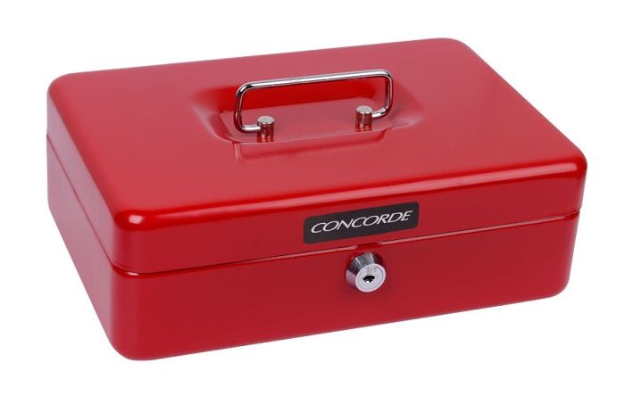 Kovová pokladna vyrobená z ocelového plechu. Obsahuje přihrádku na mince a volný prostor pro bankovky či dokumenty. Uzamykatelná a přenosná. O rozměru 250 x 180 90cm.
