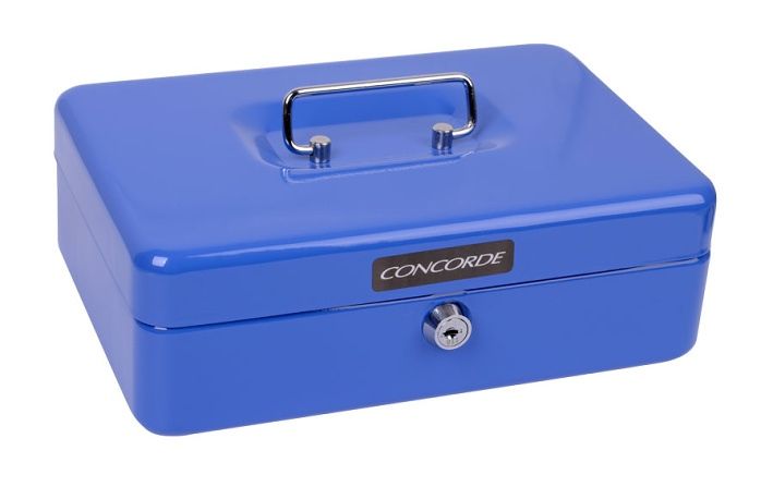 Kovová pokladna vyrobená z ocelového plechu. Obsahuje přihrádku na mince a volný prostor pro bankovky či dokumenty. Uzamykatelná a přenosná. O rozměru 250 x 180 90cm.