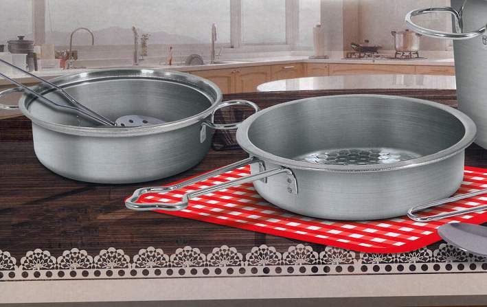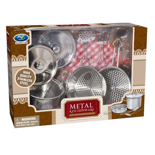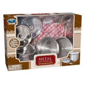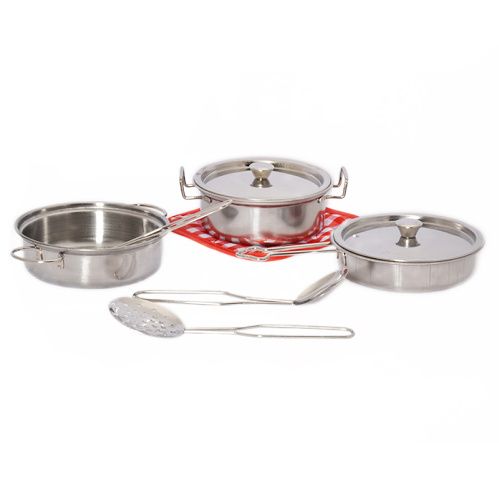 Nerezová sada nádobí, která obsahuje 2 hrnce, 2 pokličky, pánvičku, naběračku, 2 obracečky s otvory a utěrku. Nezbytný doplněk do kuchyňky pro všechny malé kuchtíky.