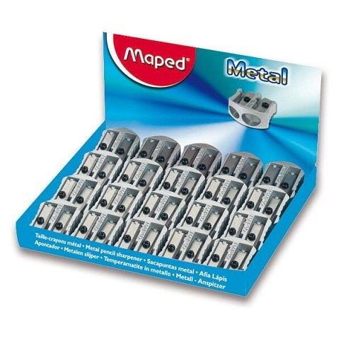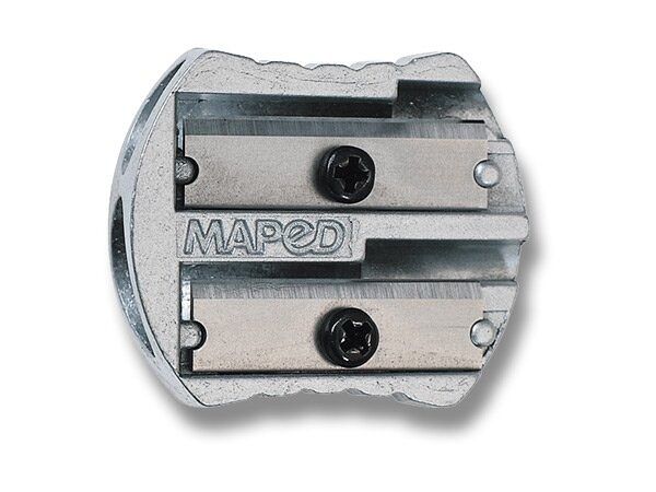 Ořezávátko MAPED Metal Classic dvojité. Kovové ořezávátko se dvěmi komorami na obyčejnou tužku a na silné pastelky (například u nás prodávané pod kódem 26148). Pro trojhranné i šestihranné tužky a pastelky.