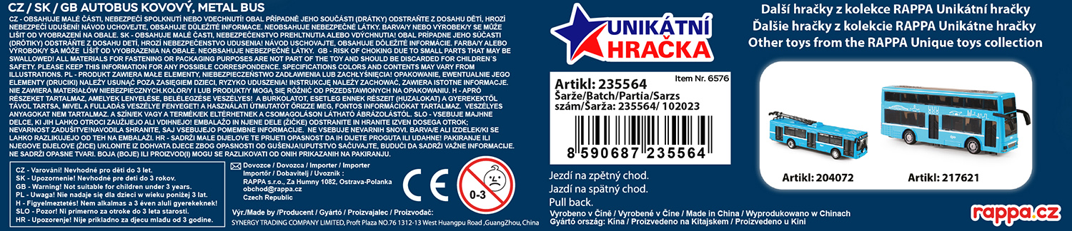 Moderní kovový autobus v modrém provedení je unikátní hračkou, která nadchne všechny malé i velké fanoušky dopravních prostředků. Autobus je dlouhý cca 18 cm, jezdí na zpětný chod a je velmi podobný tomu, který jezdí ulicemi v Ostravě. Tato hračka byla vyrobena ve spolupráci s Dopravním podnikem města Ostravy a městem OSTRAVA!!!