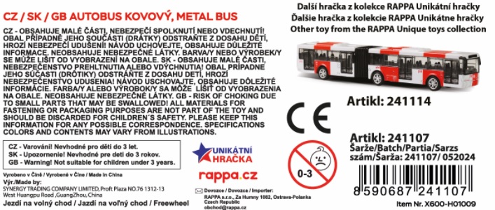Kovový mini autobus v červeném provedení je unikátní hračkou, která nadchne všechny malé i velké fanoušky dopravních prostředků. Autobus je dlouhý cca 8,5 cm, jezdí na volný chod a je velmi podobný tomu, který jezdí ulicemi v Praze. Tato hračka byla vyrobena ve spolupráci s Dopravním podnikem hlavního města Prahy.