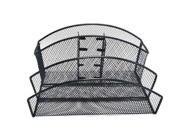 Kovový drátěný organizér s pěti přihrádkami na psací a kancelářské potřeby v černé barvě. Rozměry: šířka 22cm, výška 12,5cm, hloubka 12,8cm.