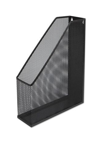 Kovový stojan na katalogy v černé barvě. Rozměry: šířka 25cm, výška 31,5cm, hloubka 7,4cm. Stojan lze připevnit na stěnu.