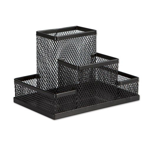 Kovový drátěný stojánek se čtyřmi přihrádkami na psací a kancelářské potřeby v černé barvě. Rozměry: šířka 15,3cm, výška 10,3cm, hloubka 10cm.