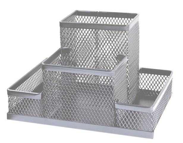 Kovový drátěný stojánek se čtyřmi přihrádkami na psací a kancelářské potřeby ve stříbrné barvě. Rozměry: šířka 15,3cm, výška 10,3cm, hloubka 10cm.
