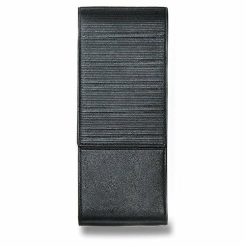 Pouzdro z měkké černé nappa kůže s vyraženými proužky na zavírací klopě, pro 3 pera.