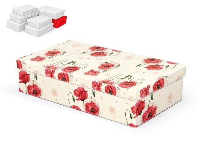 Dárková celoroční krabice o rozměrech 36 x 22 x 9 cm Dárková krabice s motivem květů vlčího máku. Vhodná ke slavnostním příležitostem, pro zabalení dárků na oslavy, svatby nebo jen tak, k uschování různých drobností. Při vložení do košíku se automaticky vloží i ostatní krabičky, tak aby jste měli v košíku vždy celý, kompletní set. Uvedená cena je za 1 ks. Materiál: 1,5 mm karton, potažený luxusním papírem Set obsahuje tyto krabice: 5371068 Krabice dárková A-C008-A 24x16x6 cm 5371069 Krabice dárková A-C008-B 26x17x6 cm 5371070 Krabice dárková A-C008-C 28x18x7 cm 5371071 Krabice dárková A-C008-D 30x19x7 cm 5371072 Krabice dárková A-C008-E 32x20x8 cm 5371073 Krabice dárková A-C008-F 34x22x8 cm 5371074 Krabice dárková A-C008-G 36x22x9 cm