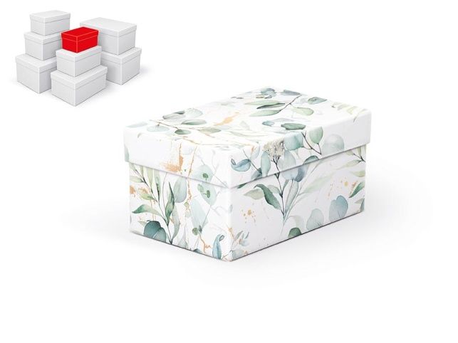 Dárková celoroční krabice o rozměrech 16 x 10 x 8 cm Dárková krabice s designem eukalyptových listů. Vhodná ke slavnostním příležitostem, pro zabalení dárků na oslavy, svatby nebo jen tak, k uschování různých drobností. Při vložení do košíku se automaticky vloží i ostatní krabičky, tak aby jste měli v košíku vždy celý, kompletní set. Uvedená cena je za 1 ks. Materiál: 1,5 mm karton, potažený luxusním papírem Set obsahuje tyto krabice: 5371075 Krabice dárková B-C008-A 16x10x8 cm 5371076 Krabice dárková B-C008-B 18x11x9 cm 5371077 Krabice dárková B-C008-C 20x12x10 cm 5371078 Krabice dárková B-C008-D 22x14x11 cm 5371079 Krabice dárková B-C008-E 24x16x12 cm 5371080 Krabice dárková B-C008-F 26x17x13 cm 5371081 Krabice dárková B-C008-G 28x18x14 cm 5371082 Krabice dárková B-C008-H 30x19x15 cm