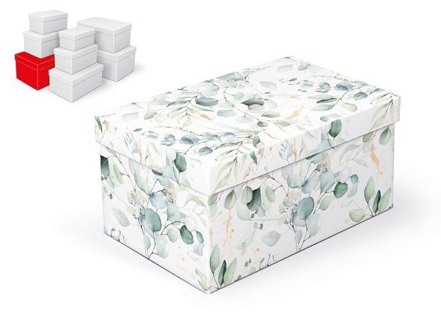 Dárková celoroční krabice o rozměrech 28 x 18 x 14 cm Dárková krabice s designem eukalyptových listů. Vhodná ke slavnostním příležitostem, pro zabalení dárků na oslavy, svatby nebo jen tak, k uschování různých drobností. Při vložení do košíku se automaticky vloží i ostatní krabičky, tak aby jste měli v košíku vždy celý, kompletní set. Uvedená cena je za 1 ks. Materiál: 1,5 mm karton, potažený luxusním papírem Set obsahuje tyto krabice: 5371075 Krabice dárková B-C008-A 16x10x8 cm 5371076 Krabice dárková B-C008-B 18x11x9 cm 5371077 Krabice dárková B-C008-C 20x12x10 cm 5371078 Krabice dárková B-C008-D 22x14x11 cm 5371079 Krabice dárková B-C008-E 24x16x12 cm 5371080 Krabice dárková B-C008-F 26x17x13 cm 5371081 Krabice dárková B-C008-G 28x18x14 cm 5371082 Krabice dárková B-C008-H 30x19x15 cm