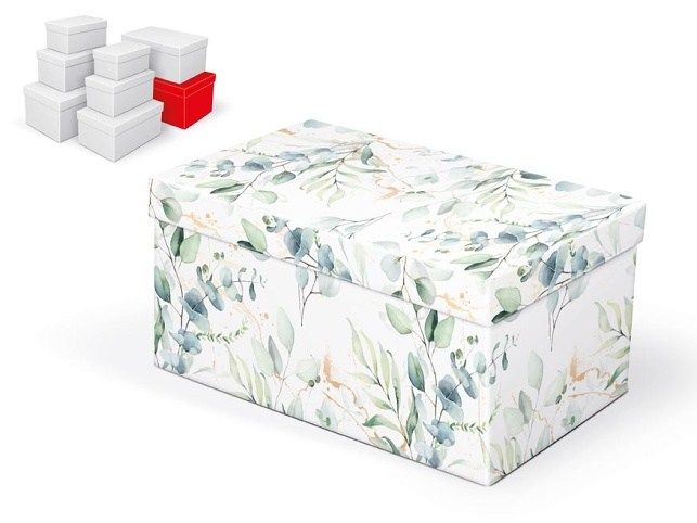 Dárková celoroční krabice o rozměrech 30 x 19 x 15 cm Dárková krabice s designem eukalyptových listů. Vhodná ke slavnostním příležitostem, pro zabalení dárků na oslavy, svatby nebo jen tak, k uschování různých drobností. Při vložení do košíku se automaticky vloží i ostatní krabičky, tak aby jste měli v košíku vždy celý, kompletní set. Uvedená cena je za 1 ks. Materiál: 1,5 mm karton, potažený luxusním papírem Set obsahuje tyto krabice: 5371075 Krabice dárková B-C008-A 16x10x8 cm 5371076 Krabice dárková B-C008-B 18x11x9 cm 5371077 Krabice dárková B-C008-C 20x12x10 cm 5371078 Krabice dárková B-C008-D 22x14x11 cm 5371079 Krabice dárková B-C008-E 24x16x12 cm 5371080 Krabice dárková B-C008-F 26x17x13 cm 5371081 Krabice dárková B-C008-G 28x18x14 cm 5371082 Krabice dárková B-C008-H 30x19x15 cm