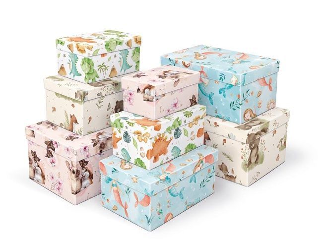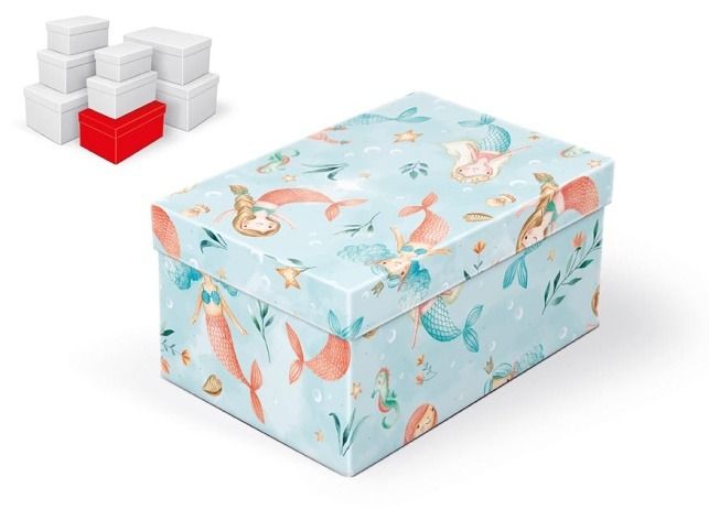 Dětská dárkovákrabice o rozměrech 24 x 16 x 12 cm Dárková krabice s dětským motivem mořských panen. Vhodná ke slavnostním příležitostem, pro zabalení dárků na oslavy nebo jen tak, k uschování různých drobností. Při vložení do košíku se automaticky vloží i ostatní krabičky, tak aby jste měli v košíku vždy celý, kompletní set. Uvedená cena je za 1 ks. Materiál: 1,5 mm karton, potažený luxusním papírem Set obsahuje tyto krabice: 5371083 Krabice dárková B-C009-A 16x10x8 cm 5371084 Krabice dárková B-C009-B 18x11x9 cm 5371085 Krabice dárková B-C009-C 20x12x10 cm 5371086 Krabice dárková B-C009-D 22x14x11 cm 5371087 Krabice dárková B-C009-E 24x16x12 cm 5371088 Krabice dárková B-C009-F 26x17x13 cm 5371089 Krabice dárková B-C009-G 28x18x14 cm 5371090 Krabice dárková B-C009-H 30x19x15 cm