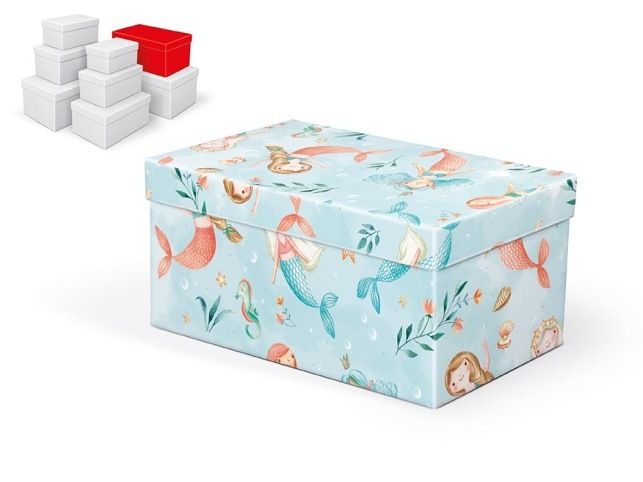 Dětská dárkovákrabice o rozměrech 26 x 17 x 13 cm Dárková krabice s dětským motivem mořských panen. Vhodná ke slavnostním příležitostem, pro zabalení dárků na oslavy nebo jen tak, k uschování různých drobností. Při vložení do košíku se automaticky vloží i ostatní krabičky, tak aby jste měli v košíku vždy celý, kompletní set. Uvedená cena je za 1 ks. Materiál: 1,5 mm karton, potažený luxusním papírem Set obsahuje tyto krabice: 5371083 Krabice dárková B-C009-A 16x10x8 cm 5371084 Krabice dárková B-C009-B 18x11x9 cm 5371085 Krabice dárková B-C009-C 20x12x10 cm 5371086 Krabice dárková B-C009-D 22x14x11 cm 5371087 Krabice dárková B-C009-E 24x16x12 cm 5371088 Krabice dárková B-C009-F 26x17x13 cm 5371089 Krabice dárková B-C009-G 28x18x14 cm 5371090 Krabice dárková B-C009-H 30x19x15 cm