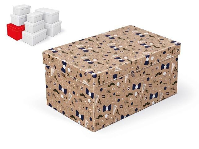 Celoroční dárková krabice o rozměrech 28 x 18 x 14 cm NÁHODNÝ MIX Tato stylová dárková krabička v přírodním tónu s motivem knírků, brýlí a motýlků zaujme na první pohled. Ideální pro pánské dárky, tematické balení nebo jako netradiční dekorace. Spojuje originalitu s praktičností a hodí se pro každého, kdo ocení vtip i styl. Krabička není samostatně prodejná – při vložení do košíku obdržíte celou sadu. Jednotlivé krabičky se liší velikostí i vzorem, ale ladí do jednoho hravého a zároveň elegantního celku. Skvěle poslouží pro balení dárků, uložení drobností nebo jako zajímavý doplněk do interiéru. Materiál: 1,5 mm karton, potažený papírem s potiskem Set obsahuje tyto krabice: 5371265 Krabice dárková B-C011-A 16x10x8 cm 5371266 Krabice dárková B-C011-B 18x11x9 cm 5371267 Krabice dárková B-C011-C 20x12x10 cm 5371268 Krabice dárková B-C011-D 22x14x11 cm 5371269 Krabice dárková B-C011-E 24x16x12 cm 5371270 Krabice dárková B-C011-F 26x17x13 cm 5371271 Krabice dárková B-C011-G 28x18x14 cm 5371272 Krabice dárková B-C011-H 30x19x15 cm Uvedená cena je za 1 ks.