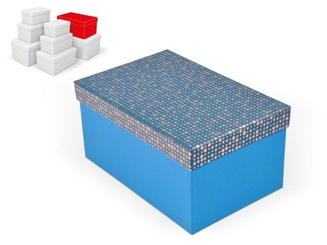 Celoroční dárková krabice o rozměrech 26 × 17 × 13 cm NÁHODNÝ MIX Výrazná, stylová a rozhodně nepřehlédnutelná Dárková krabička v jasně modrém tónu s tmavým víkem posetým zlatými puntíky působí sebevědomě a moderně. Díky kombinaci výrazných barev a elegantního detailu je ideální pro dárky, které mají udělat dojem – bez ohledu na příležitost. Díky většímu objemu ji využijete i na kosmetické sady, oblečení, drobnou elektroniku nebo jako praktickou úložnou krabici s designovým přesahem. Do košíku se automaticky přidává celá sada 8 krabiček. Motivy ani barvy nejsou pevně přiřazené k velikostem a mohou se lišit v každé sadě. Výsledkem je vždy originální kombinace, která překvapí svou pestrostí. Materiál: 1,5 mm karton, potažený papírem s potiskem Set obsahuje tyto krabice: 5371332 Krabice dárková B-C012-A 16x10x8 cm 5371333 Krabice dárková B-C012-B 18x11x9 cm 5371334 Krabice dárková B-C012-C 20x12x10 cm 5371335 Krabice dárková B-C012-D 22x14x11 cm 5371336 Krabice dárková B-C012-E 24x16x12 cm 5371337 Krabice dárková B-C012-F 26x17x13 cm 5371338 Krabice dárková B-C012-G 28x18x14 cm 5371339 Krabice dárková B-C012-H 30x19x15 cm Uvedená cena je za 1 ks.