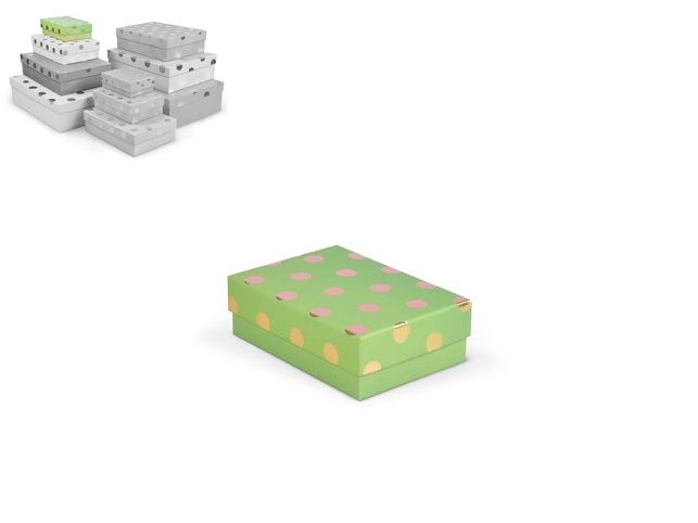 Celoroční dárková krabice o rozměrech 17 x 12 x 5,5 cm NÁHODNÝ MIX Dárková krabice v mixu barev se zlatými puntíky. Vhodná pro slavnostní příležitosti, dekorativní účely, balení osobních darů nebo k uschování různých drobností. Při vložení jedné krabičky do košíku se automaticky přidá celá sada, která zahrnuje krabičky s různými designy a velikostmi. Tato variabilita zaručuje, že budete mít krabičky vhodné pro různé příležitosti a typy dárků. Krabičky jsou elegantně navrženy a ladí k sobě svými barvami a vzory, čímž vytvářejí harmonickou sadu ideální pro každou příležitost. Materiál: 1,5 mm karton, potažený papírem s potiskem Set obsahuje tyto krabice: 5371115 Krabice dárková D-L002-A 14,5x10x5cm 5371116 Krabice dárková D-L002-B 17x12x5,5cm 5371117 Krabice dárková D-L002-C 19x13,5x6cm 5371118 Krabice dárková D-L002-D 22x16x6,5cm 5371119 Krabice dárková D-L002-E 24,5x17,5x7cm 5371120 Krabice dárková D-L002-F 27,5x19,5x7,5cm 5371121 Krabice dárková D-L002-G 29x21x8cm 5371122 Krabice dárková D-L002-H 33x23,5x9cm 5371123 Krabice dárková D-L002-I 35x25x10cm 5371124 Krabice dárková D-L002-J 37x27x11cm Uvedená cena je za 1 ks.