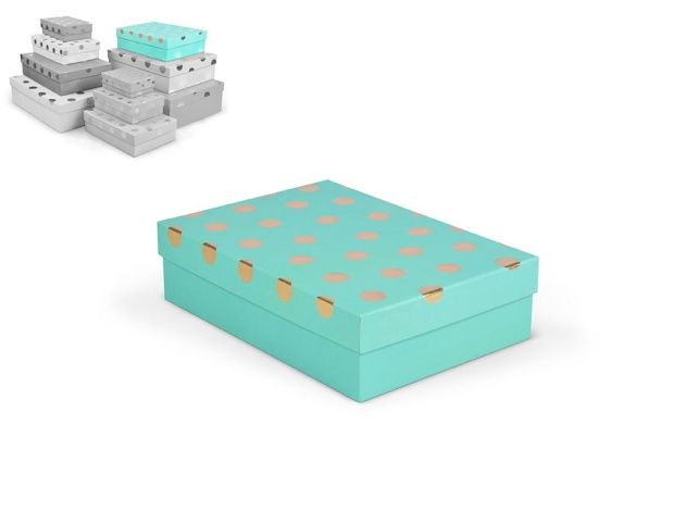 Celoroční dárková krabice o rozměrech 27,5 x 19,5 x 7,5 cm NÁHODNÝ MIX Dárková krabice v mixu barev se zlatými puntíky. Vhodná pro slavnostní příležitosti, dekorativní účely, balení osobních darů nebo k uschování různých drobností. Při vložení jedné krabičky do košíku se automaticky přidá celá sada, která zahrnuje krabičky s různými designy a velikostmi. Tato variabilita zaručuje, že budete mít krabičky vhodné pro různé příležitosti a typy dárků. Krabičky jsou elegantně navrženy a ladí k sobě svými barvami a vzory, čímž vytvářejí harmonickou sadu ideální pro každou příležitost. Materiál: 1,5 mm karton, potažený papírem s potiskem Set obsahuje tyto krabice: 5371115 Krabice dárková D-L002-A 14,5x10x5cm 5371116 Krabice dárková D-L002-B 17x12x5,5cm 5371117 Krabice dárková D-L002-C 19x13,5x6cm 5371118 Krabice dárková D-L002-D 22x16x6,5cm 5371119 Krabice dárková D-L002-E 24,5x17,5x7cm 5371120 Krabice dárková D-L002-F 27,5x19,5x7,5cm 5371121 Krabice dárková D-L002-G 29x21x8cm 5371122 Krabice dárková D-L002-H 33x23,5x9cm 5371123 Krabice dárková D-L002-I 35x25x10cm 5371124 Krabice dárková D-L002-J 37x27x11cm Uvedená cena je za 1 ks.