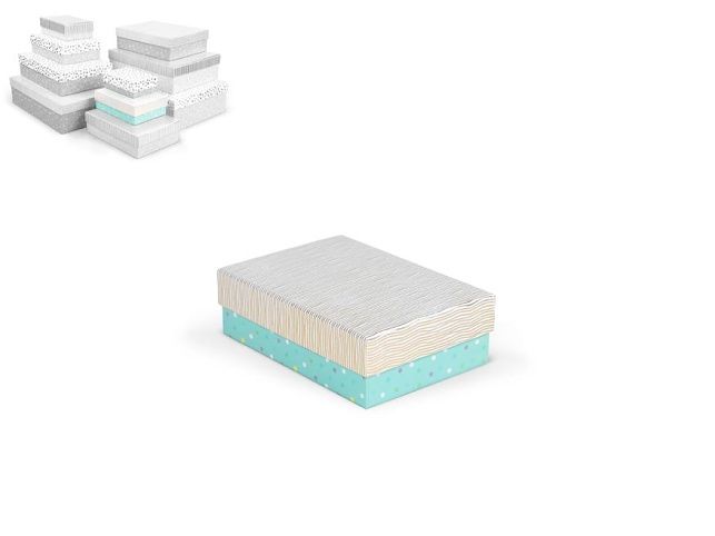 Celoroční dárková krabice o rozměrech 19 x 13,5 x 6 cm NÁHODNÝ MIX Dárková krabice v mixu pastelových barev s různými vzory, jako jsou puntíky, proužky nebo texturovaný povrch. Vzory a barvy jsou sladěny tak, aby vytvářely harmonický a elegantní vzhled. Vhodná pro slavnostní příležitosti, dekorativní účely, balení osobních darů nebo k uschování různých drobností. Při vložení jedné krabičky do košíku se automaticky přidá celá sada, která zahrnuje krabičky s různými designy a velikostmi. Tato variabilita zaručuje, že budete mít krabičky vhodné pro různé příležitosti a typy dárků. Krabičky jsou elegantně navrženy a ladí k sobě svými barvami a vzory, čímž vytvářejí harmonickou sadu ideální pro každou příležitost. Materiál: 1,5 mm karton, potažený papírem s potiskem Set obsahuje tyto krabice: 5371135 Krabice dárková D-L004-A 14,5x10x5cm 5371136 Krabice dárková D-L004-B 17x12x5,5cm 5371137 Krabice dárková D-L004-C 19x13,5x6cm 5371138 Krabice dárková D-L004-D 22x16x6,5cm 5371139 Krabice dárková D-L004-E 24,5x17,5x7cm 5371140 Krabice dárková D-L004-F 27,5x19,5x7,5cm 5371141 Krabice dárková D-L004-G 29x21x8cm 5371142 Krabice dárková D-L004-H 33x23,5x9cm 5371143 Krabice dárková D-L004-I 35x25x10cm 5371144 Krabice dárková D-L004-J 37x27x11cm Uvedená cena je za 1 ks.