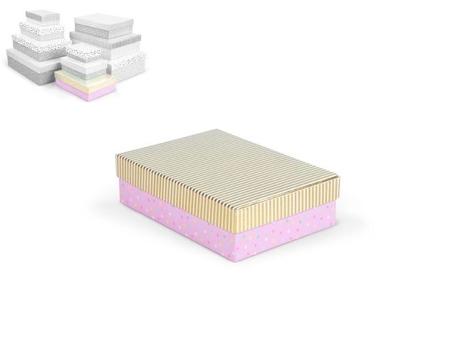 Celoroční dárková krabice o rozměrech 24,5 x 17,5 x 7 cm NÁHODNÝ MIX Dárková krabice v mixu pastelových barev s různými vzory, jako jsou puntíky, proužky nebo texturovaný povrch. Vzory a barvy jsou sladěny tak, aby vytvářely harmonický a elegantní vzhled. Vhodná pro slavnostní příležitosti, dekorativní účely, balení osobních darů nebo k uschování různých drobností. Při vložení jedné krabičky do košíku se automaticky přidá celá sada, která zahrnuje krabičky s různými designy a velikostmi. Tato variabilita zaručuje, že budete mít krabičky vhodné pro různé příležitosti a typy dárků. Krabičky jsou elegantně navrženy a ladí k sobě svými barvami a vzory, čímž vytvářejí harmonickou sadu ideální pro každou příležitost. Materiál: 1,5 mm karton, potažený papírem s potiskem Set obsahuje tyto krabice: 5371135 Krabice dárková D-L004-A 14,5x10x5cm 5371136 Krabice dárková D-L004-B 17x12x5,5cm 5371137 Krabice dárková D-L004-C 19x13,5x6cm 5371138 Krabice dárková D-L004-D 22x16x6,5cm 5371139 Krabice dárková D-L004-E 24,5x17,5x7cm 5371140 Krabice dárková D-L004-F 27,5x19,5x7,5cm 5371141 Krabice dárková D-L004-G 29x21x8cm 5371142 Krabice dárková D-L004-H 33x23,5x9cm 5371143 Krabice dárková D-L004-I 35x25x10cm 5371144 Krabice dárková D-L004-J 37x27x11cm Uvedená cena je za 1 ks.