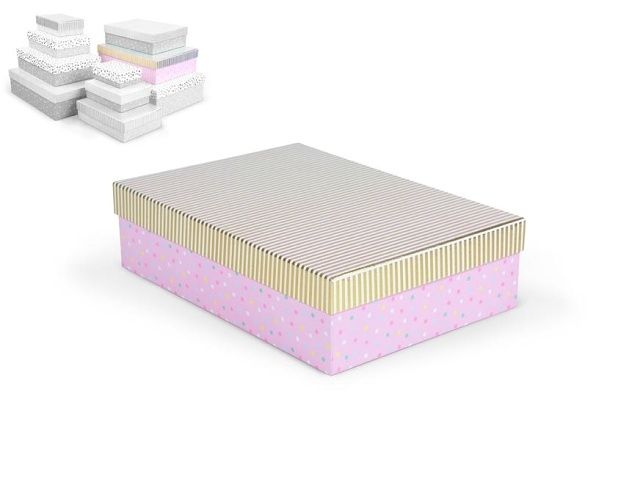 Celoroční dárková krabice o rozměrech 33 x 23,5 x 9 cm NÁHODNÝ MIX Dárková krabice v mixu pastelových barev s různými vzory, jako jsou puntíky, proužky nebo texturovaný povrch. Vzory a barvy jsou sladěny tak, aby vytvářely harmonický a elegantní vzhled. Vhodná pro slavnostní příležitosti, dekorativní účely, balení osobních darů nebo k uschování různých drobností. Při vložení jedné krabičky do košíku se automaticky přidá celá sada, která zahrnuje krabičky s různými designy a velikostmi. Tato variabilita zaručuje, že budete mít krabičky vhodné pro různé příležitosti a typy dárků. Krabičky jsou elegantně navrženy a ladí k sobě svými barvami a vzory, čímž vytvářejí harmonickou sadu ideální pro každou příležitost. Materiál: 1,5 mm karton, potažený papírem s potiskem Set obsahuje tyto krabice: 5371135 Krabice dárková D-L004-A 14,5x10x5cm 5371136 Krabice dárková D-L004-B 17x12x5,5cm 5371137 Krabice dárková D-L004-C 19x13,5x6cm 5371138 Krabice dárková D-L004-D 22x16x6,5cm 5371139 Krabice dárková D-L004-E 24,5x17,5x7cm 5371140 Krabice dárková D-L004-F 27,5x19,5x7,5cm 5371141 Krabice dárková D-L004-G 29x21x8cm 5371142 Krabice dárková D-L004-H 33x23,5x9cm 5371143 Krabice dárková D-L004-I 35x25x10cm 5371144 Krabice dárková D-L004-J 37x27x11cm Uvedená cena je za 1 ks.
