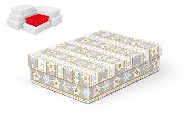 Vánoční dárková krabice s motivem vloček a vánočních hvězd. S touto krabicí bude Váš dárek rychle a reprezentativně zabalen.