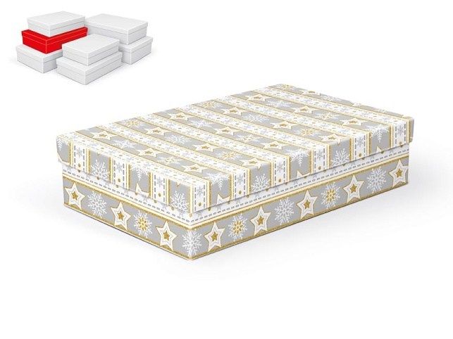 Vánoční dárková krabice s motivem vloček a vánočních hvězd. S touto krabicí bude Váš dárek rychle a reprezentativně zabalen.