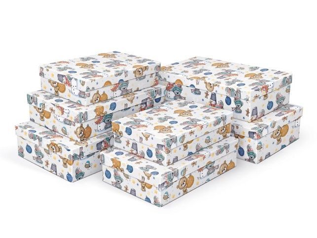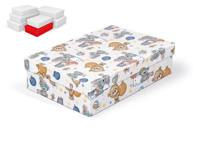 Vánoční, dárková krabice o rozměrech 28 x 18 x 7 cm Dárková krabice s dětským motivem medvídků, vánočních ozdob a sněhuláků. Při vložení do košíku se automaticky vloží i ostatní krabičky, tak aby jste měli v košíku vždy celý, kompletní set. Uvedená cena je za 1 ks. Materiál: 1,5 mm karton, potažený papírem s potiskem Set obsahuje tyto krabice: 5371023 Krabice dárková vánoční A-V010-A 24x16x6 cm 5371024 Krabice dárková vánoční A-V010-B 26x17x6 cm 5371025 Krabice dárková vánoční A-V010-C 28x18x7 cm 5371026 Krabice dárková vánoční A-V010-D 30x19x7 cm 5371027 Krabice dárková vánoční A-V010-E 32x20x8 cm 5371028 Krabice dárková vánoční A-V010-F 34x22x8 cm 5371029 Krabice dárková vánoční A-V010-G 36x22x9 cm