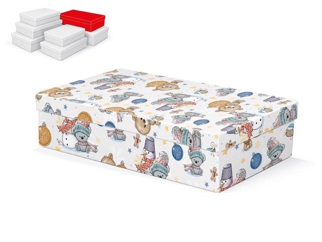 Vánoční, dárková krabice o rozměrech 32 x 20 x 8 cm Dárková krabice s dětským motivem medvídků, vánočních ozdob a sněhuláků. Při vložení do košíku se automaticky vloží i ostatní krabičky, tak aby jste měli v košíku vždy celý, kompletní set. Uvedená cena je za 1 ks. Materiál: 1,5 mm karton, potažený papírem s potiskem Set obsahuje tyto krabice: 5371023 Krabice dárková vánoční A-V010-A 24x16x6 cm 5371024 Krabice dárková vánoční A-V010-B 26x17x6 cm 5371025 Krabice dárková vánoční A-V010-C 28x18x7 cm 5371026 Krabice dárková vánoční A-V010-D 30x19x7 cm 5371027 Krabice dárková vánoční A-V010-E 32x20x8 cm 5371028 Krabice dárková vánoční A-V010-F 34x22x8 cm 5371029 Krabice dárková vánoční A-V010-G 36x22x9 cm