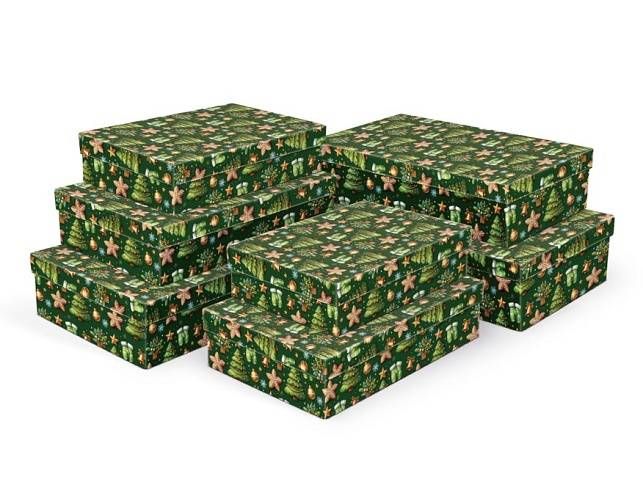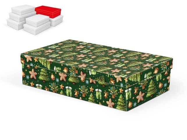 Vánoční dárková krabice o rozměrech 32 x 20 x 8 cm Vánoční dárková krabice je pokryta dekorativním papírem s vánočními motivy. Povrch krabice zdobí vzor se zelenými vánočními stromečky, zlatými hvězdami, vánočními ozdobami a perníčky ve tvaru hvězd. Barva pozadí je tmavě zelená, což vytváří krásný kontrast s barevnými motivy. Jejich slavnostní a elegantní vzhled je ideální pro balení vánočních dárků. Při vložení do košíku se automaticky vloží i ostatní krabičky, tak aby jste měli v košíku vždy celý, kompletní set. Materiál: 1,5 mm karton, potažený luxusním papírem SET OBSAHUJE TYTO KRABICE: 5371145 Krabice dárková vánoční A-V011-A 24x16x6 cm 5371146 Krabice dárková vánoční A-V011-B 26x17x6 cm 5371147 Krabice dárková vánoční A-V011-C 28x18x7 cm 5371148 Krabice dárková vánoční A-V011-D 30x19x7 cm 5371149 Krabice dárková vánoční A-V011-E 32x20x8 cm 5371150 Krabice dárková vánoční A-V011-F 34x22x8 cm 5371151 Krabice dárková vánoční A-V011-G 36x22x9 cm Uvedená cena je za 1 ks.