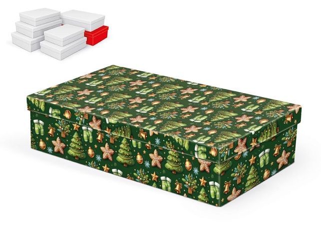 Vánoční dárková krabice o rozměrech 36 x 22 x 9 cm Vánoční dárková krabice je pokryta dekorativním papírem s vánočními motivy. Povrch krabice zdobí vzor se zelenými vánočními stromečky, zlatými hvězdami, vánočními ozdobami a perníčky ve tvaru hvězd. Barva pozadí je tmavě zelená, což vytváří krásný kontrast s barevnými motivy. Jejich slavnostní a elegantní vzhled je ideální pro balení vánočních dárků. Při vložení do košíku se automaticky vloží i ostatní krabičky, tak aby jste měli v košíku vždy celý, kompletní set. Materiál: 1,5 mm karton, potažený luxusním papírem SET OBSAHUJE TYTO KRABICE: 5371145 Krabice dárková vánoční A-V011-A 24x16x6 cm 5371146 Krabice dárková vánoční A-V011-B 26x17x6 cm 5371147 Krabice dárková vánoční A-V011-C 28x18x7 cm 5371148 Krabice dárková vánoční A-V011-D 30x19x7 cm 5371149 Krabice dárková vánoční A-V011-E 32x20x8 cm 5371150 Krabice dárková vánoční A-V011-F 34x22x8 cm 5371151 Krabice dárková vánoční A-V011-G 36x22x9 cm 5371151 Krabice dárková vánoční A-V009-G 36x22x9 cm Uvedená cena je za 1 ks.