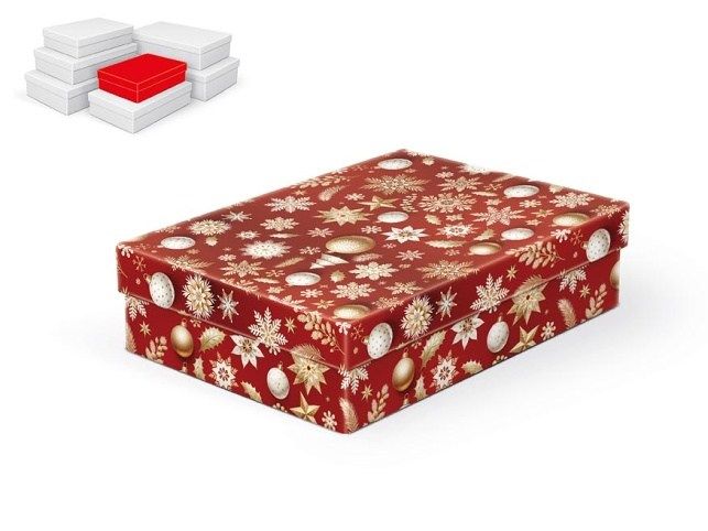 Vánoční dárková krabice o rozměrech 24 x 16 x 6 cm Slavnostní vánoční dárková krabice s pevným víkem, v červeném provedení se zlatými a bílými motivy vloček, hvězd a ozdob. Její elegantní design podtrhne kouzlo Vánoc a dodá vašim darům výjimečný vzhled. Díky praktickým rozměrům je ideální pro balení drobnějších dárků, jako jsou šperky, kosmetika, sladkosti nebo malé dekorace. Po vložení této krabice do košíku se automaticky přidá celá sada 7 krabiček ve stejném vánočním designu, ale v různých velikostech. Získáte tak kompletní kolekci, která zajistí jednotné a působivé balení všech vánočních dárků pod stromečkem. Materiál: 1,5 mm karton, potažený papírem s potiskem Set obsahuje tyto krabice: 5371301 Krabice dárková A-V012-A 24x16x6 cm 5371302 Krabice dárková A-V012-B 26x17x6 cm 5371303 Krabice dárková A-V012-C 28x18x7 cm 5371304 Krabice dárková A-V012-D 30x19x7 cm 5371305 Krabice dárková A-V012-E 32x20x8 cm 5371306 Krabice dárková A-V012-F 34x22x8 cm 5371307 Krabice dárková A-V012-G 36x22x9 cm Uvedená cena je za 1 ks.