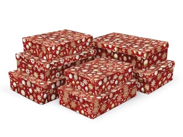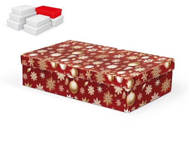 Vánoční dárková krabice o rozměrech 32 x20 x 8 cm Vánoční dárková krabice v červeném provedení se zlatými a bílými motivy vloček, hvězd a ozdob je elegantním a praktickým řešením pro balení svátečních překvapení. Její výrazný design okamžitě vytvoří kouzelnou atmosféru a dodá vašim darům slavnostní vzhled. Nemusíte se trápit balicím papírem – dárek stačí vložit a je připraven k předání. Po vložení této položky do košíku se objednává vždy sada 7 krabiček ve stejném vánočním designu, pouze v různých velikostech. Jednotlivě je zakoupit nelze. Materiál: 1,5 mm karton, potažený papírem s potiskem Set obsahuje tyto krabice: 5371301 Krabice dárková A-V012-A 24x16x6 cm 5371302 Krabice dárková A-V012-B 26x17x6 cm 5371303 Krabice dárková A-V012-C 28x18x7 cm 5371304 Krabice dárková A-V012-D 30x19x7 cm 5371305 Krabice dárková A-V012-E 32x20x8 cm 5371306 Krabice dárková A-V012-F 34x22x8 cm 5371307 Krabice dárková A-V012-G 36x22x9 cm Uvedená cena je za 1 ks.