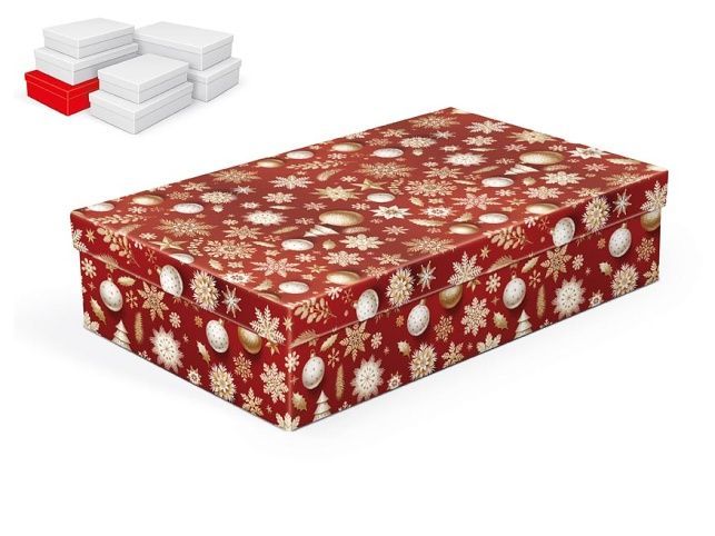 Vánoční dárková krabice o rozměrech 34 x 22 x 8 cm Prostorná vánoční dárková krabice v červeném provedení se zlatými a bílými motivy vloček, hvězd a ozdob dodá každému daru slavnostní nádech a stane se ozdobou pod stromečkem. Její výrazný design navodí opravdovou sváteční atmosféru a z balení dárků udělá radost sama o sobě. Objednávka této položky zahrnuje vždy sadu 7 krabiček stejného vánočního motivu v různých velikostech. Jednotlivě je koupit nelze. Set obsahuje tyto krabice: 5371301 Krabice dárková A-V012-A 24x16x6 cm 5371302 Krabice dárková A-V012-B 26x17x6 cm 5371303 Krabice dárková A-V012-C 28x18x7 cm 5371304 Krabice dárková A-V012-D 30x19x7 cm 5371305 Krabice dárková A-V012-E 32x20x8 cm 5371306 Krabice dárková A-V012-F 34x22x8 cm 5371307 Krabice dárková A-V012-G 36x22x9 cm Uvedená cena je za 1 ks.