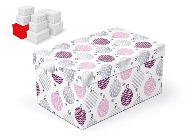 Dárková krabice s motivem vánočních ozdob. S touto krabicí bude Váš dárek rychle a reprezentativně zabalen.