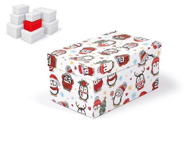 Vánoční, dárková krabice o rozměrech 20 x 12 x 10 cm Dárková krabice s dětským, vánočním motivem tučňáků. Při vložení do košíku se automaticky vloží i ostatní krabičky, tak aby jste měli v košíku vždy celý, kompletní set. Uvedená cena je za 1 ks. Materiál: 1,5 mm karton, potažený papírem s potiskem Set obsahuje tyto krabice: 5371038 Krabice dárková B-V009-A 16x10x8 cm 5371039 Krabice dárková B-V009-B 18x11x9 cm 5371040 Krabice dárková B-V009-C 20x12x10 cm 5371041 Krabice dárková B-V009-D 22x14x11 cm 5371042 Krabice dárková B-V009-E 24x16x12 cm 5371043 Krabice dárková B-V009-F 26x17x13 cm 5371044 Krabice dárková B-V009-G 28x18x14 cm 5371045 Krabice dárková B-V009-H 30x19x15 cm