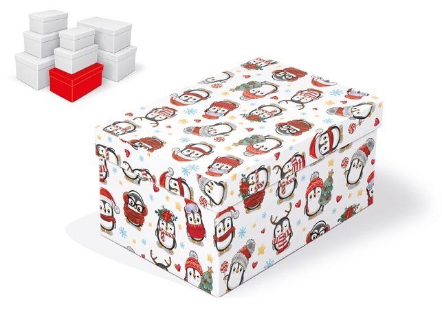Vánoční, dárková krabice o rozměrech 24 x 16 x 12 cm Dárková krabice s dětským, vánočním motivem tučňáků. Při vložení do košíku se automaticky vloží i ostatní krabičky, tak aby jste měli v košíku vždy celý, kompletní set. Uvedená cena je za 1 ks. Materiál: 1,5 mm karton, potažený papírem s potiskem Set obsahuje tyto krabice: 5371038 Krabice dárková B-V009-A 16x10x8 cm 5371039 Krabice dárková B-V009-B 18x11x9 cm 5371040 Krabice dárková B-V009-C 20x12x10 cm 5371041 Krabice dárková B-V009-D 22x14x11 cm 5371042 Krabice dárková B-V009-E 24x16x12 cm 5371043 Krabice dárková B-V009-F 26x17x13 cm 5371044 Krabice dárková B-V009-G 28x18x14 cm 5371045 Krabice dárková B-V009-H 30x19x15 cm