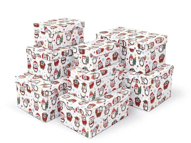 Vánoční, dárková krabice o rozměrech 24 x 16 x 12 cm Dárková krabice s dětským, vánočním motivem tučňáků. Při vložení do košíku se automaticky vloží i ostatní krabičky, tak aby jste měli v košíku vždy celý, kompletní set. Uvedená cena je za 1 ks. Materiál: 1,5 mm karton, potažený papírem s potiskem Set obsahuje tyto krabice: 5371038 Krabice dárková B-V009-A 16x10x8 cm 5371039 Krabice dárková B-V009-B 18x11x9 cm 5371040 Krabice dárková B-V009-C 20x12x10 cm 5371041 Krabice dárková B-V009-D 22x14x11 cm 5371042 Krabice dárková B-V009-E 24x16x12 cm 5371043 Krabice dárková B-V009-F 26x17x13 cm 5371044 Krabice dárková B-V009-G 28x18x14 cm 5371045 Krabice dárková B-V009-H 30x19x15 cm