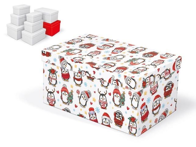 Vánoční, dárková krabice o rozměrech 30 x 19 x 15 cm Dárková krabice s dětským, vánočním motivem tučňáků. Při vložení do košíku se automaticky vloží i ostatní krabičky, tak aby jste měli v košíku vždy celý, kompletní set. Uvedená cena je za 1 ks. Materiál: 1,5 mm karton, potažený papírem s potiskem Set obsahuje tyto krabice: 5371038 Krabice dárková B-V009-A 16x10x8 cm 5371039 Krabice dárková B-V009-B 18x11x9 cm 5371040 Krabice dárková B-V009-C 20x12x10 cm 5371041 Krabice dárková B-V009-D 22x14x11 cm 5371042 Krabice dárková B-V009-E 24x16x12 cm 5371043 Krabice dárková B-V009-F 26x17x13 cm 5371044 Krabice dárková B-V009-G 28x18x14 cm 5371045 Krabice dárková B-V009-H 30x19x15 cm
