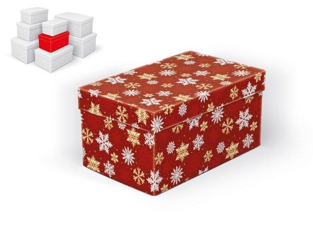 Vánoční dárková krabice o rozměrech 20 x 12 x 10 cm Vánoční dárková krabice je vyrobena z pevného kartonu a pokryta dekorativním papírem s vánočními motivy. Povrch krabice zdobí vzor s bílými a zlatými vločkami. Barva pozadí je červená, což vytváří krásný kontrast s barevnými motivy. Jejich slavnostní a elegantní vzhled je ideální pro balení vánočních dárků. Při vložení do košíku se automaticky vloží i ostatní krabičky, tak aby jste měli v košíku vždy celý, kompletní set. Materiál: 1,5 mm karton, potažený luxusním papírem SET OBSAHUJE TYTO KRABICE: 5371152 Krabice dárková B-C010-A 16x10x8 cm 5371153 Krabice dárková B-C010-B 18x11x9 cm 5371154 Krabice dárková B-C010-C 20x12x10 cm 5371155 Krabice dárková B-C010-D 22x14x11 cm 5371156 Krabice dárková B-C010-E 24x16x12 cm 5371157 Krabice dárková B-C010-F 26x17x13 cm 5371158 Krabice dárková B-C010-G 28x18x14 cm 5371159 Krabice dárková B-C010-H 30x19x15 cm Uvedená cena je za 1 ks.
