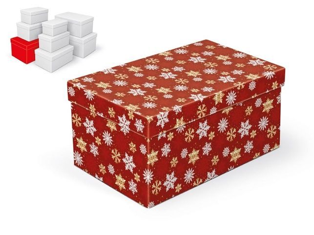 Vánoční dárková krabice o rozměrech 28 x 18 x 14 cm Vánoční dárková krabice je vyrobena z pevného kartonu a pokryta dekorativním papírem s vánočními motivy. Povrch krabice zdobí vzor s bílými a zlatými vločkami. Barva pozadí je červená, což vytváří krásný kontrast s barevnými motivy. Jejich slavnostní a elegantní vzhled je ideální pro balení vánočních dárků. Při vložení do košíku se automaticky vloží i ostatní krabičky, tak aby jste měli v košíku vždy celý, kompletní set. Materiál: 1,5 mm karton, potažený luxusním papírem SET OBSAHUJE TYTO KRABICE: 5371152 Krabice dárková B-C010-A 16x10x8 cm 5371153 Krabice dárková B-C010-B 18x11x9 cm 5371154 Krabice dárková B-C010-C 20x12x10 cm 5371155 Krabice dárková B-C010-D 22x14x11 cm 5371156 Krabice dárková B-C010-E 24x16x12 cm 5371157 Krabice dárková B-C010-F 26x17x13 cm 5371158 Krabice dárková B-C010-G 28x18x14 cm 5371159 Krabice dárková B-C010-H 30x19x15 cm Uvedená cena je za 1 ks.